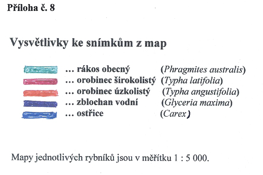 - Přílohy č. 9-17: Barevné zákresy rákosinných porostů v mapových snímcích